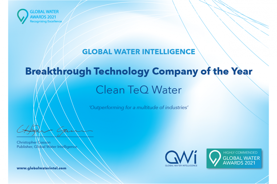 Clean TeQ Water is pleased to announce it has received a Highly Commended Award for Global Water Intelligence's Breakthrough Technology Company of the Year.